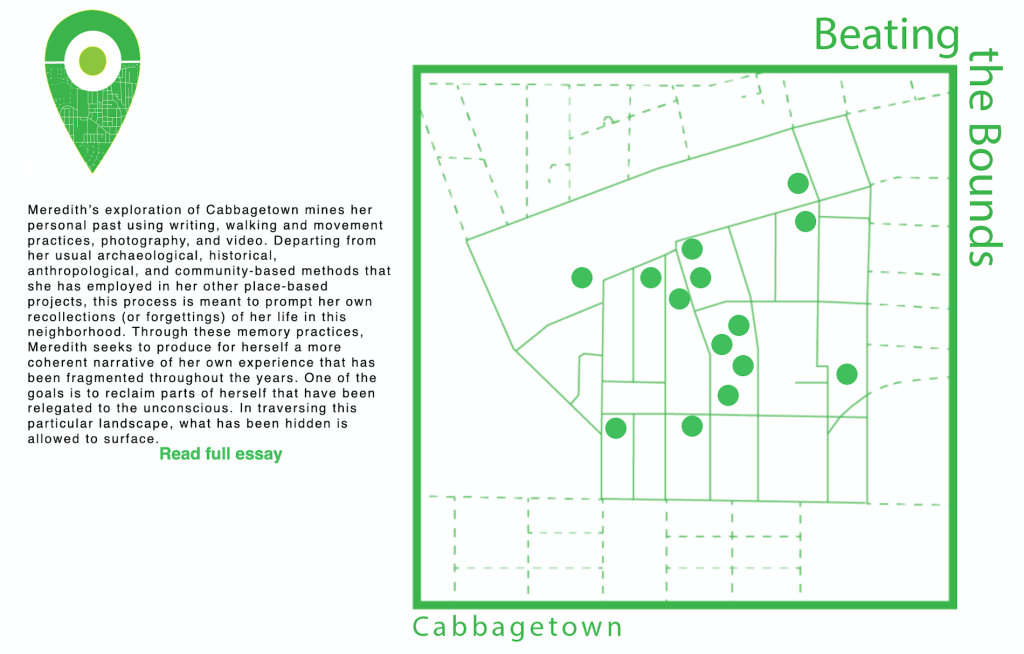 I focused on Cabbagetown and my experience of the neighborhood. I mined my personal past using writing, walking and movement practices, photography, and video. Departing from my usual archaeological, historical, anthropological, and community-based methods that I have employed in other place-based projects, this process was meant to prompt my own recollections (or forgettings) of my life in this neighborhood. Through these memory practices, I sought to produce for myself a more coherent narrative of mt own experience that has been fragmented throughout the years. One of the goals was to reclaim parts of myself that have been relegated to the unconscious. In traversing this particular landscape, what has been hidden is allowed to surface.